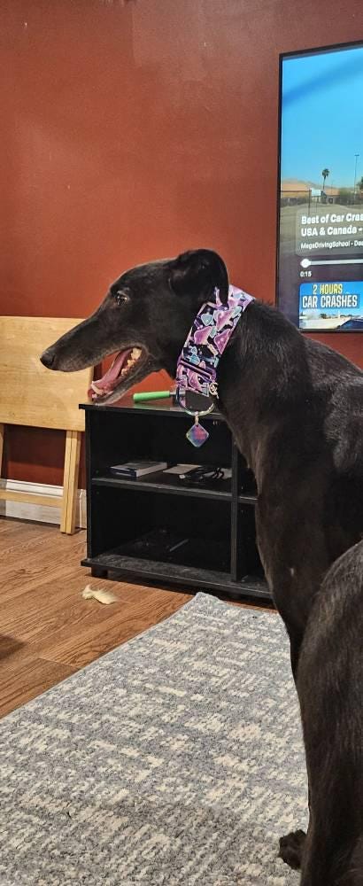 Stunning collar! The colors are absolutely vibrant and the rainbow chrome hardware just adds that exta touch. It stands out so beautifully on my white Greyhound.